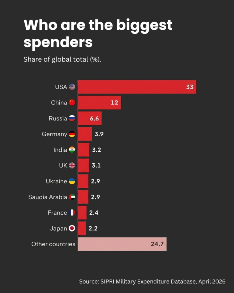 The top three military spenders—the U.S., China, and Russia—accounted for 51% of global spending.