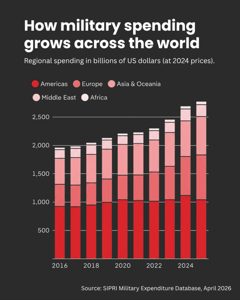 According to new data from the Stockholm International Peace Research Institute (SIPRI), governments spent a total of €2.47 trillion on military expenditures—the highest amount ever recorded.